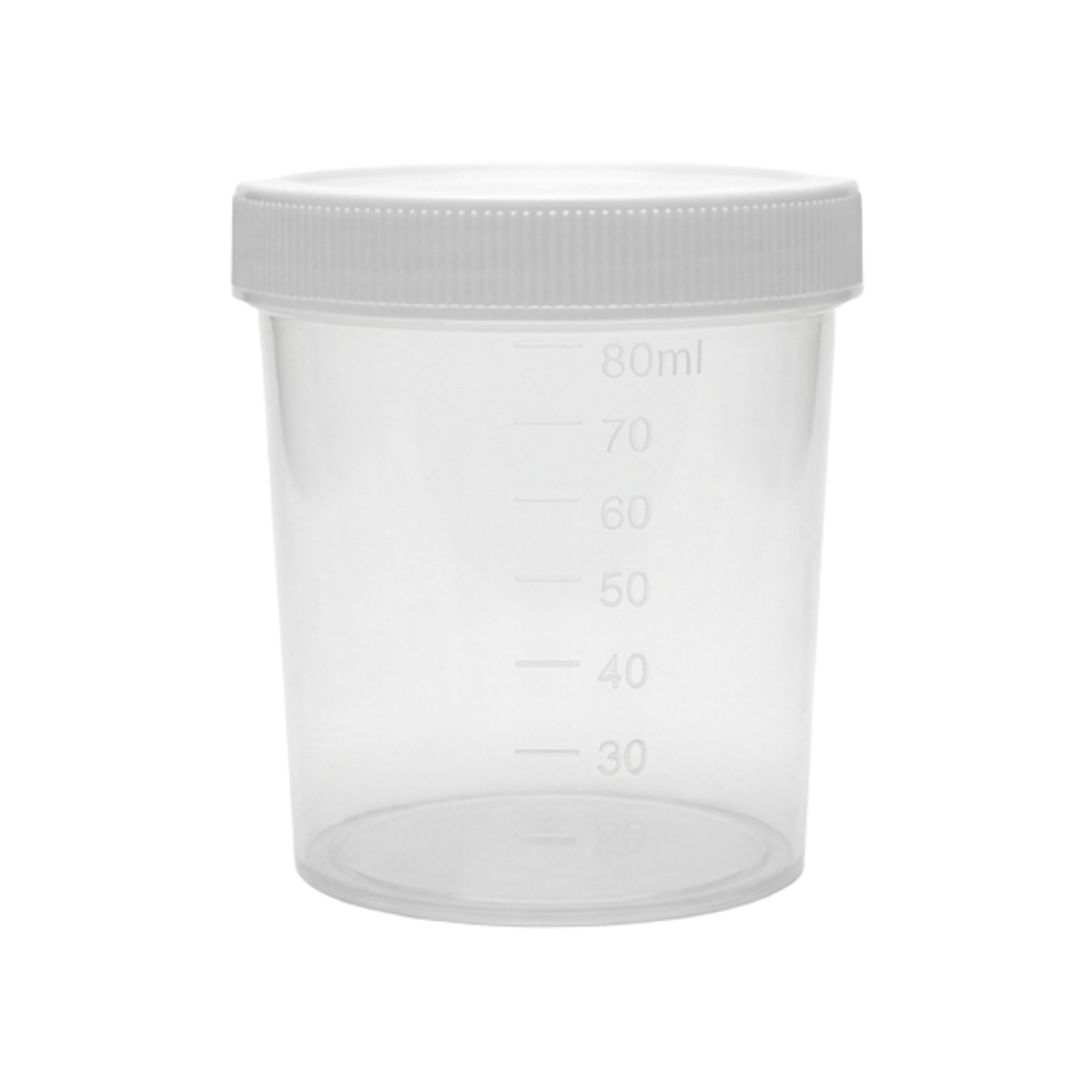 COLETOR ESTÉRIL RADIAÇÃO IONIZANTE, TRANSPARENTE, SEM PÁ, TAMPA BRANCA, 80 ML